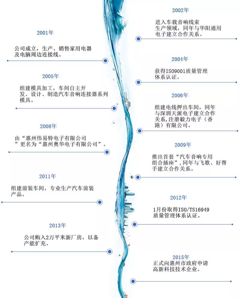 惠州奧華電子有限公司成立于2001年,公司占地面積10000平方米,建筑面積12000平方米,員工600余人。擁有一批優秀的研發、技術、生產管理人才。專業開發、生產、銷售汽車插座、線束、精密連接器等汽車部件。具有汽車連接器全程制造能力,包括精密模具、塑膠成型、五金沖壓、電線電纜、零部件及線束生產。公司產品已廣泛應用于汽車音響、空調、防盜器、GPS導航、天窗、倒車雷達、電動門窗、儀表等汽車電子行業,并與國內外電子企業建立了良好的合作伙伴關系。