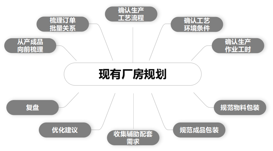 總體規劃產能-工廠規劃總綱,做什么產品,做多大量,決定著規劃規模,是我們在工廠規劃項目考慮因素,并充分結合如下步驟展開規劃:
