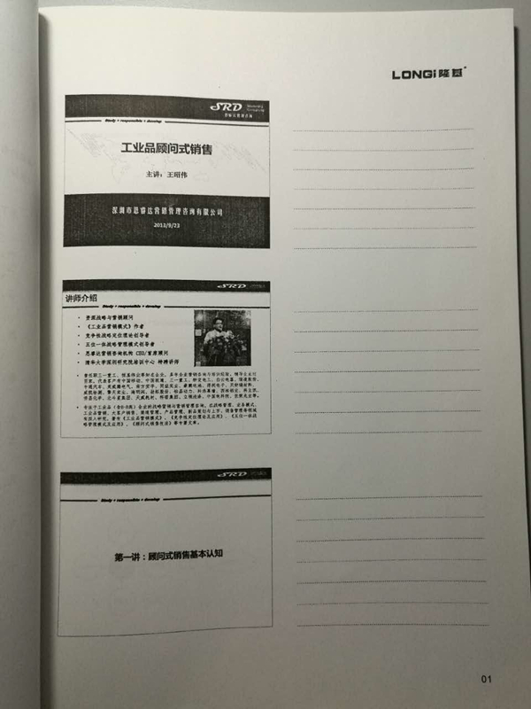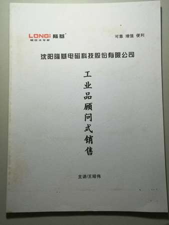 2013年10月7日,應(yīng)沈陽隆基電磁科技股份有限公司領(lǐng)導(dǎo)邀請,為隆基電磁培訓(xùn)《工業(yè)品顧問式銷售》,與隆基營銷團隊100余人交流分享了工業(yè)品銷售相關(guān)技能。