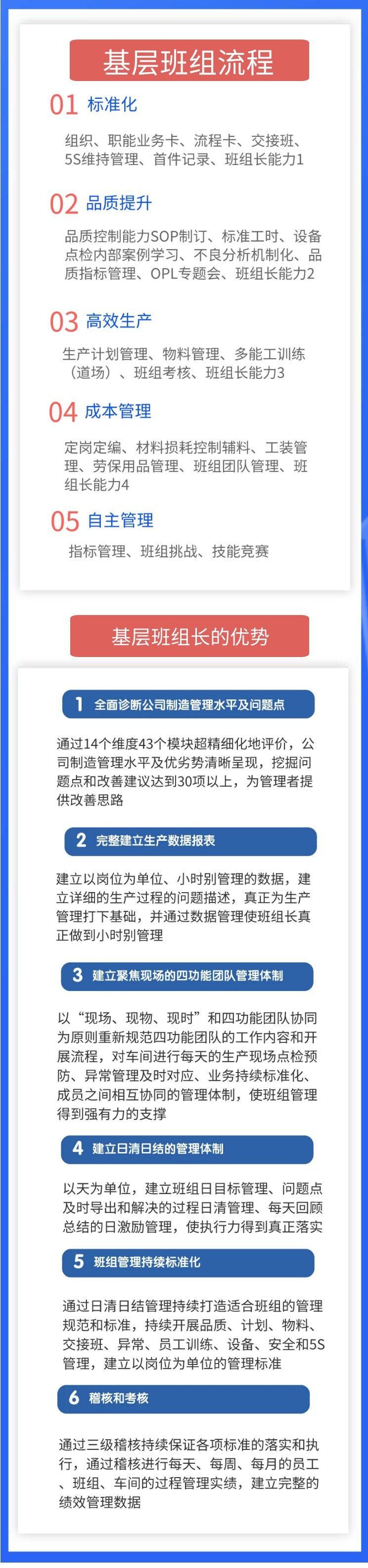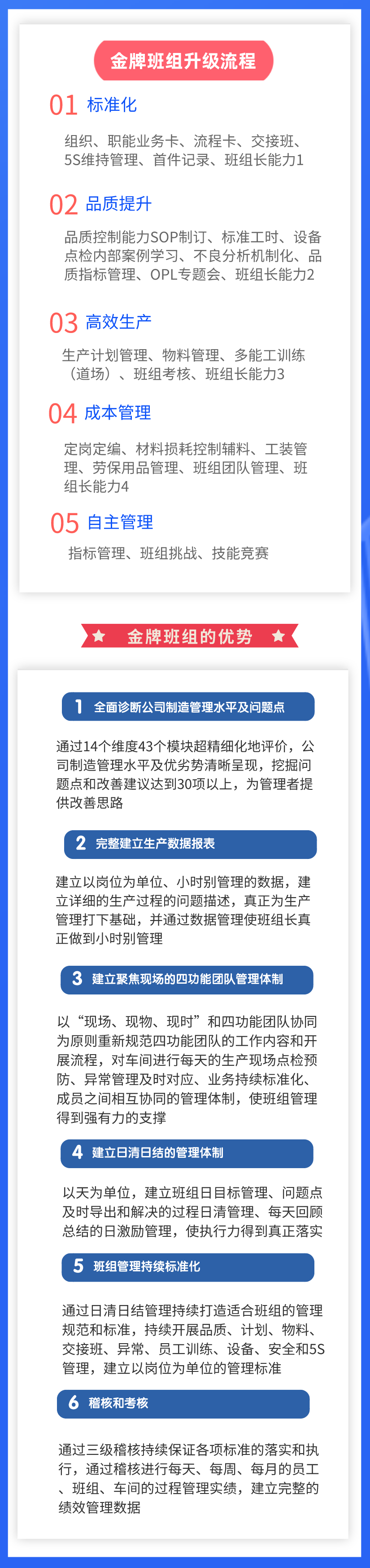 遠(yuǎn)大咨詢(xún)集團(tuán)根據(jù)100多家企業(yè)服務(wù)經(jīng)驗(yàn)開(kāi)發(fā)基層班組管理咨詢(xún)產(chǎn)品。以推進(jìn)班組管理各方面業(yè)務(wù)的標(biāo)準(zhǔn)化開(kāi)始,從班組管理規(guī)范化開(kāi)始,逐步推進(jìn)班組的品質(zhì)管理能力,效率管理能力,成本管理能力,逐步達(dá)到班組自主管理的程度。