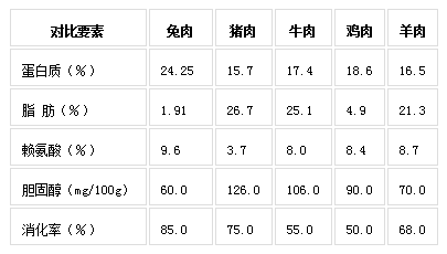 現(xiàn)代科學(xué)研究表明,兔肉營養(yǎng)價值豐富,纖維細嫩,味道鮮美,適合現(xiàn)代生活對肉質(zhì)的要求。兔肉具有高蛋白(含蛋白質(zhì)21~23%)、高賴氨酸(賴氨酸占蛋白質(zhì)的9.6%)、高消化率(達85%)、高煙酸(高達12.8毫克/百克);低脂肪(僅為4.9%)、低膽固醇(為65毫克/百克)、低脲酸、低熱量等特點。因此,兔肉自古以來便享有“葷中之素”的美稱。
