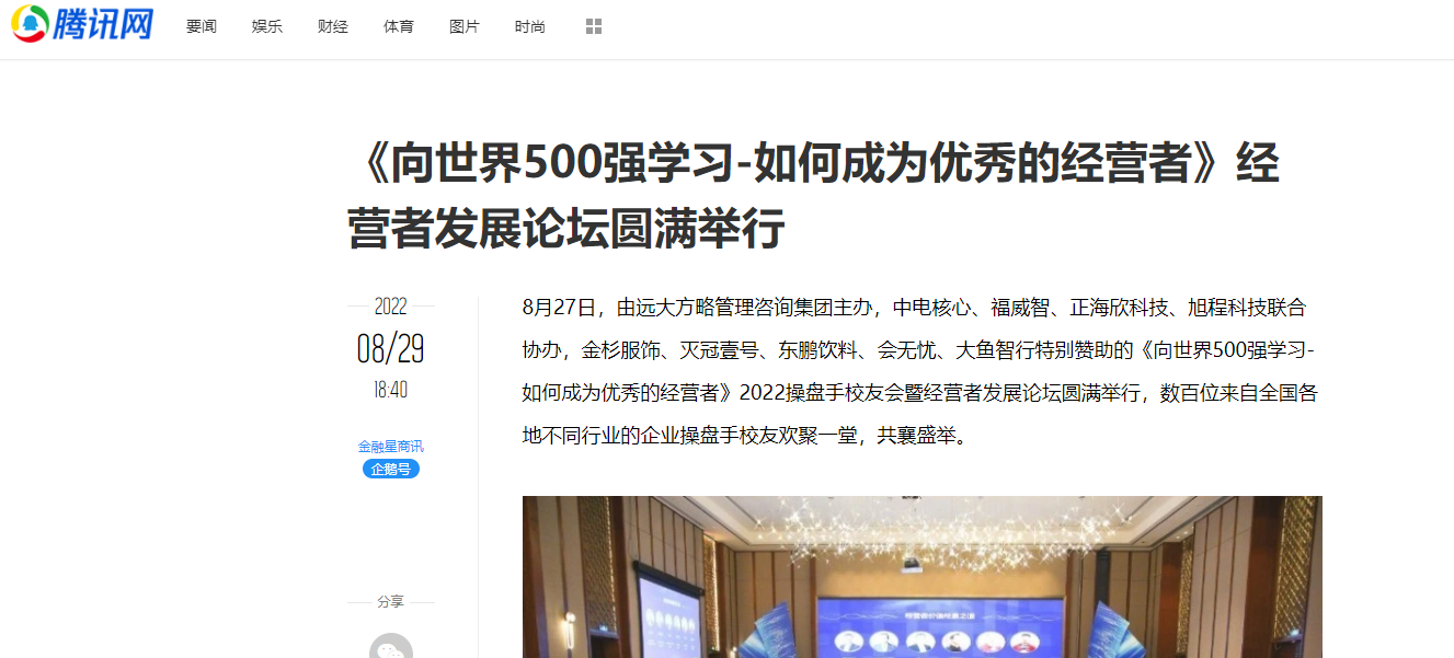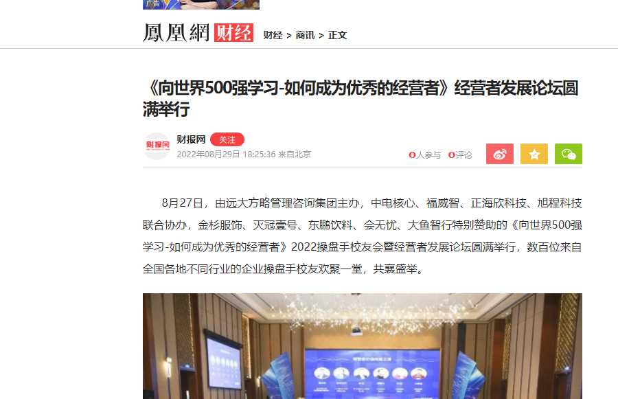 8月27日,由遠大方略管理咨詢集團主辦,中電核心、福威智、正海欣科技、旭程科技聯合協辦,金杉服飾、滅冠壹號、東鵬飲料、會無憂、大魚智行特別贊助的《向世界500強學習-如何成為優秀的經營者》2022操盤手校友會暨經營者發展論壇圓滿舉行,數百位來自全國各地不同行業的企業操盤手校友歡聚一堂,共襄盛舉。