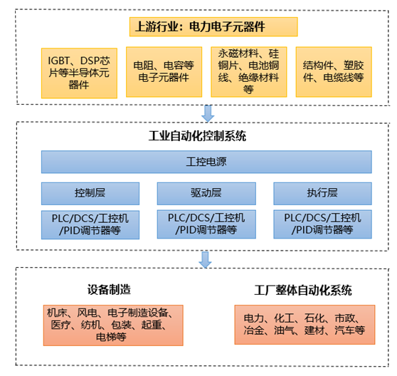 工控電源產業鏈主要包括原材料供應商、工業自動化控制系統供應商、OEM型行業客戶和項目型行業客戶。其中,產業鏈上游是原材料供應商,主要提供半導體元器件、電子元器件、永磁材料、硅鋼片、電磁銅線、絕緣材料、結構件、塑膠件、電纜線等;產業鏈中游為工業自動化控制系統供應商,負責將工控電源、控制層、驅動層、執行層部件集成為工業自動化控制系統;產業鏈的下游行業分為設備制造市場和工廠整體自動化系統的設計和實施市場。