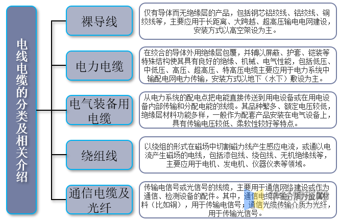 電線電纜行業產業鏈上游主要為銅材、鋁材、橡膠、塑料等原材料;中游為電線電纜生產供應環節,主要產品包括裸導線、電力電纜、電氣裝備用電纜、繞線組、通信電纜及光纖;下游廣泛應用于電力、通信、軌道交通、建筑工程、工程機械、新能源等領域。