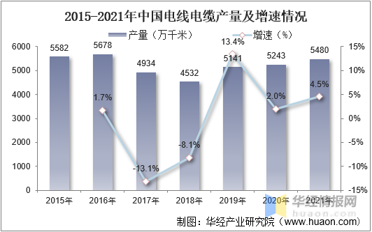 隨著近年來我國城市化、智能電網建設等進程的不斷加快,推動我國電線電纜行業快速發展。電線電纜產量也隨之逐漸增長。據資料顯示,2021年我國電線電纜產量為5480萬千米,同比增長4.5%。