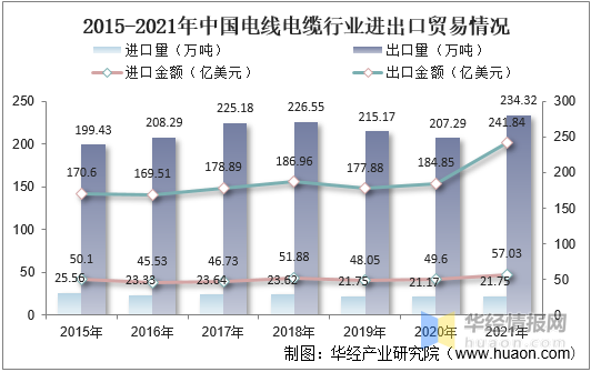 從行業進出口貿易情況來看,我國電線電纜主要以出口為主。據資料顯示,2021年我國電線電纜進口量為21.75萬噸,同比增長2.7%,進口金額為57.03億美元,同比增長15%;出口量為234.32萬噸,同比增長13%,出口金額為241.84億美元,同比增長30.8%。