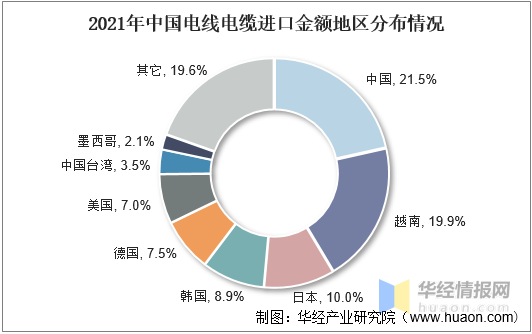 從進口分布情況來看,2021年我國電線電纜進口金額中,占比前三的地區分別為中國、越南和日本,占比分別為21.5%、19.9%和10%。