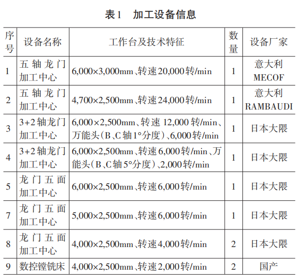 加工設(shè)備包括龍門五面加工中心4臺(tái),五軸龍門加工中心2臺(tái),3+2軸龍門加工中心2臺(tái),數(shù)控機(jī)床2臺(tái),搖臂鉆床3臺(tái),能夠滿足承接各類汽車模具覆蓋件加工需求,主要加工設(shè)備情況如表1所示。