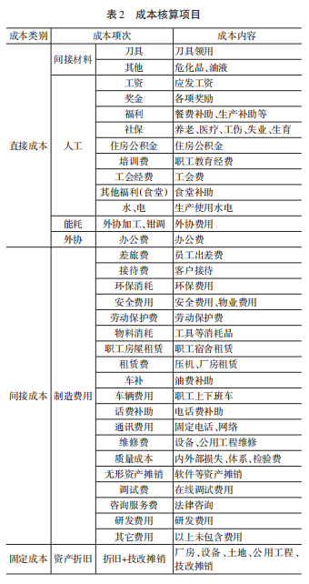 按照汽車模具制造成本構(gòu)成情況,整理成本核算涉及項(xiàng)目如表2所示。