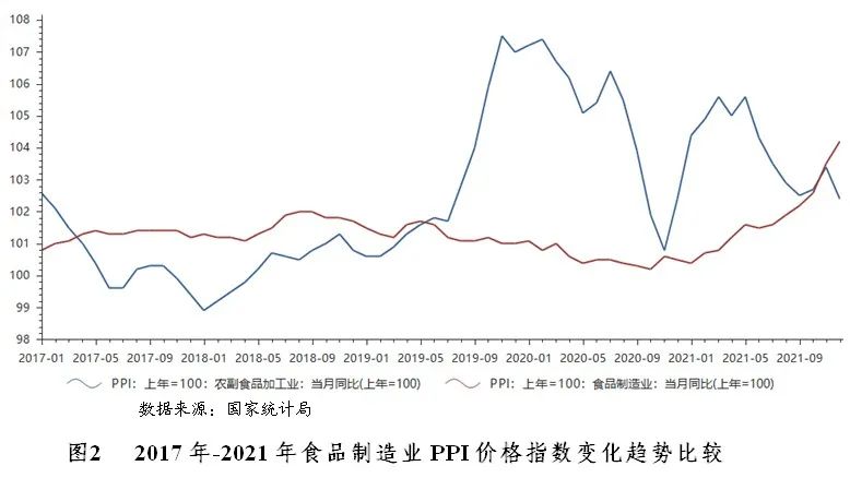 由于成本端原材料、包材、運費齊漲,產業鏈利潤被擠壓,2021年食品制造業出廠價格呈現上漲趨勢。國家統計局數據顯示,2021年食品制造業工業生產者出廠價格指數為104.20,農副食品制造業工業生產者出廠價格指數為102.4,表明食品價格較2020年同期略有增長。在“疫情”之下,食品作為剛需產品,需求下降不明顯,價格并未受到較大影響。