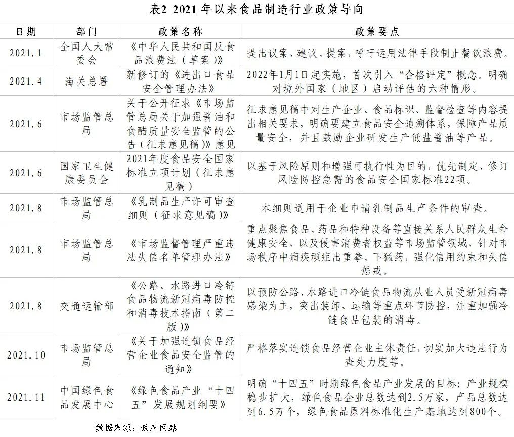 2021年,我國宏觀政策效應持續顯現為食品制造行業帶來積極作用,行業監管政策主要圍繞加強食品安全監管和推動產業健康有序地向高質量發展。