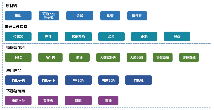 目前,可穿戴設(shè)備產(chǎn)業(yè)鏈包含了上游原材料,中游的基礎(chǔ)零件設(shè)備、物聯(lián)網(wǎng)/軟件、各種類(lèi)型的產(chǎn)品(包括從芯片解決方案到外觀設(shè)計(jì),再到生產(chǎn)組裝以及應(yīng)用開(kāi)發(fā)等一系列流程),下游經(jīng)銷(xiāo)商等。