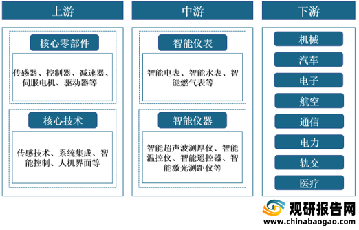 智能儀器是含有微型計算機或者微型處理器的測量儀器,擁有對數據的存儲運算邏輯判斷及自動化操作等功能。智能儀器的出現,極大地擴充了傳統儀器的應用范圍。智能儀器儀表行業產業鏈上游為核心零部件及核心技術,主要包括傳感器、控制器、減速器、傳感技術、智能控制等;中游為智能儀表產品,主要包括智能水表、智能電表、智能溫控儀等;下游為應用領域,主要包括機械、汽車、電子、航空、通信等。