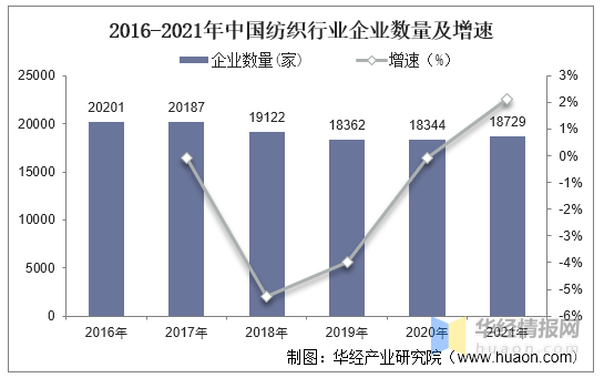 2016至2020年,我國(guó)紡織行業(yè)企業(yè)數(shù)量從20201家下降至18344家,2021年有小幅回升,達(dá)18729家,同比增長(zhǎng)2.1%。