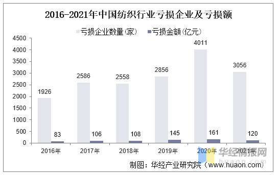 我國(guó)紡織行業(yè)虧損企業(yè)數(shù)量于2020年達(dá)到近年峰值,為4011家,同比增長(zhǎng)40.44%,虧損金額達(dá)到161億元,同比增長(zhǎng)11.03%。2021年行業(yè)虧損企業(yè)數(shù)量下降至3056家,虧損金額為120億元。