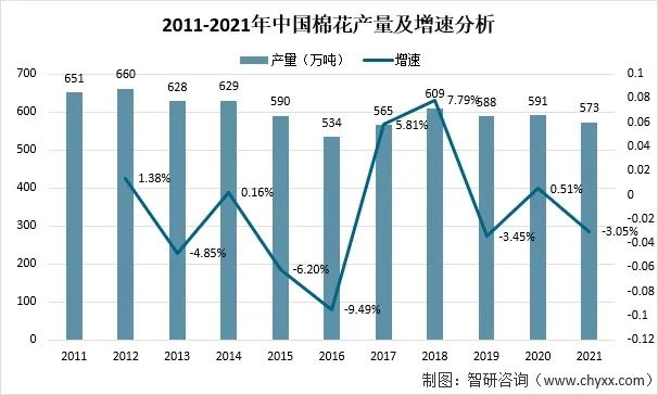2021年,受種植效益和種植結(jié)構(gòu)調(diào)整等因素影響,種植面積降幅較大,帶動(dòng)中國(guó)整體棉花種植面積及產(chǎn)量下降。全國(guó)棉花總產(chǎn)量573萬噸,比2020年減少18萬噸,下降3.05%。
