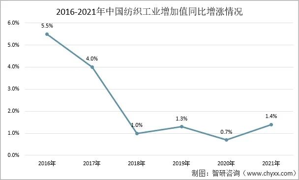 從紡織工業(yè)增加值來看,2016年-2021年中國(guó)紡織工業(yè)在穩(wěn)定增漲。2021年中國(guó)紡織工業(yè)增加值同比增漲1.4%。