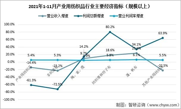 2021年1-11月產(chǎn)業(yè)用紡織品行業(yè)規(guī)模以上企業(yè)的營(yíng)業(yè)收入同比下降14.4%,利潤(rùn)總額同比下降61.3%,營(yíng)業(yè)利潤(rùn)率為5.4%。非織造布行業(yè)的營(yíng)業(yè)收入和利潤(rùn)總額分別同比下降23.2%和72.5%,營(yíng)業(yè)利潤(rùn)率為5.3%。繩、索、纜行業(yè)的營(yíng)業(yè)收入和利潤(rùn)總額分別同比增長(zhǎng)9.7%和14.2%,營(yíng)業(yè)利潤(rùn)率為4.9%。紡織帶和簾子布市場(chǎng)延續(xù)了良好的發(fā)展勢(shì)頭,營(yíng)業(yè)收入和利潤(rùn)總額分別同比增長(zhǎng)18.6%和80.2%,營(yíng)業(yè)利潤(rùn)率達(dá)到5.3%。篷、帆布的營(yíng)業(yè)收入和利潤(rùn)總額分別同比增長(zhǎng)23.6%和34.1%,6.1%的營(yíng)業(yè)利潤(rùn)率為行業(yè)最高。醫(yī)療衛(wèi)生、過濾、土工用紡織品所在的其他產(chǎn)業(yè)用紡織品的營(yíng)業(yè)收入和利潤(rùn)總額分別同比下降22.5%和63.9%,營(yíng)業(yè)利潤(rùn)率為5.5%。