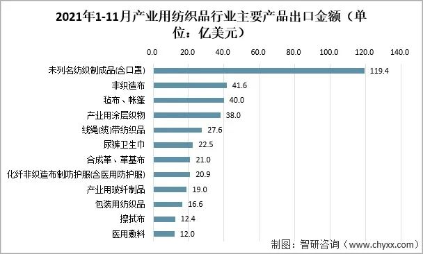 根據(jù)中國(guó)海關(guān)數(shù)據(jù),2021年1-11月我國(guó)產(chǎn)業(yè)用紡織品主要出口產(chǎn)品(按出口金額排名前十二類產(chǎn)品)的出口額為391.1億美元,同比下降53.0%。分產(chǎn)品來看,未列名紡織制成品(主要為口罩)目前是行業(yè)最大的出口產(chǎn)品,出口金額為119.4億美元,但因國(guó)外對(duì)口罩需求的大幅回落其出口額較上年同期下降了77.0%;氈布/帳篷、產(chǎn)業(yè)用涂層織物等傳統(tǒng)產(chǎn)品的出口額分別為40.0億美元和38.0億美元,同比增長(zhǎng)52.7%和33.6%;合成革及革基布的出口額為21.0億美元,同比增長(zhǎng)44.7%。非織造布及相關(guān)制品的出口呈現(xiàn)不同走勢(shì),卷材出口41.6億美元,同比下降9.0%,出口量126.0萬噸,同比小幅上漲0.8%,出口均價(jià)同比下滑9.8%;化纖非織造布制防護(hù)服(含醫(yī)用防護(hù)服)出口20.9億美元,同比下降80.2%;一次性衛(wèi)生用品出口22.5億美元,同比增長(zhǎng)10.5%。
