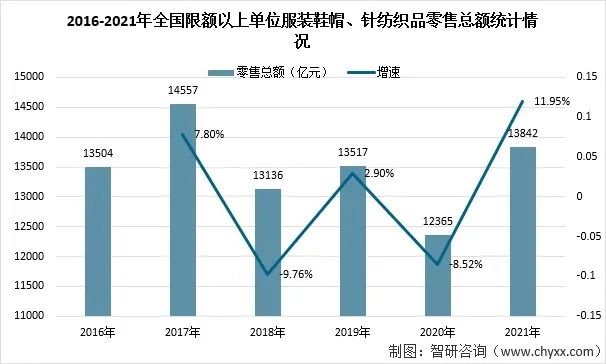 2021年全國(guó)限額以上單位服裝鞋帽、針紡織品零售總額為13842億元,同比增漲了11.95%。