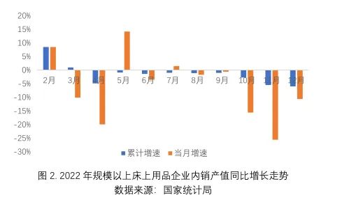 從出口情況看,2022年我國出口床上用品135.47億美元,同比下降15.46%。其中美、歐、日傳統市場下降明顯,東盟市場仍保持較高水平增長。從內銷情況看,床上用品受國內疫情影響,市場消費動力總體偏弱,傳統銷售旺季營業額較上年下滑較為明顯。國家統計局統計的1095家床上用品企業2022年內銷產值同比下降6.02%。