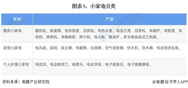 家用電器,簡稱家電,是指以電能來進行驅動(或以機械化動作)的家庭電器用具,可幫助執行家庭雜務。家電基本上可以分為大型家電和小家電。大型家電與小家電相比體積較為寬大,不易運送且較常固定擺放在一個位置,此外也可能因其耗電量較大而需要有特殊的裝置或插頭來供應電力。小家電是指一個相對于“大家電”、“白電”、“黑電”的俗稱,同時也是相對的概念,其基本特點是體積較小,價值較小,用電量較小。本文對于小家電概念界定如下:小家電指的是體積較小、功率較小且便于攜帶的,主要用于提升家庭生活品質或者個人生活質量及體驗的家用電器。
