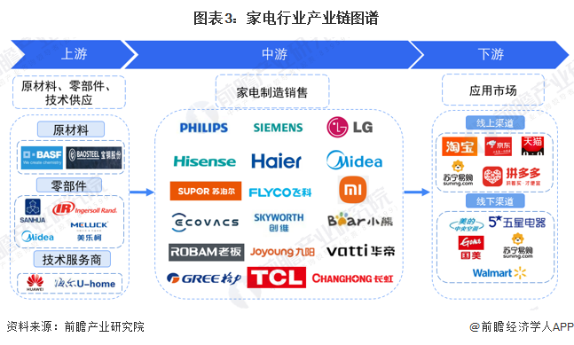 小家電產業鏈主要分為上游原材料和零部件供應、中游小家電制造和下游小家電銷售三大環節。小家電行業上游原材料和零部件包括電加熱器、電器閥件、塑料、金屬材料、包裝材料等各類零部件供應商,由于各種不同小家電所需原材料零部件不同,因此上游覆蓋企業范圍較廣,品牌也較多元化;中游小家電制造企業包含了國外大企業(如飛利浦)和國內家電綜合制造企業(如美的)、小家電制造企業各類型企業;下游主流銷售渠道有綜合電商平臺(如天貓商城、京東商城等)、線下家電賣場(如蘇寧、國美)、大型商超、各級經銷商門店、公司直營門店等各類分銷渠道。