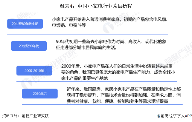中國小家電行業發展歷程可以分為四個階段,20世紀80年代中期小家電產品開始進入普通消費者家庭,初期的產品包含電風扇、電飯鍋、電熨斗等;20世紀90年代新興小家電作為時尚的象征開始走入城市居民生活;2000年后,小家電產品在人們的日常生活中扮演著越來越重要的角色,中國也開始成為小家電重要的生產基地;2010年后,產品質量和穩定性穩步提高,健康、節能、便捷、智能和養生等需求也刺激行業進一步發展。目前行業進入多品類、高質量、智能化的全新階段。