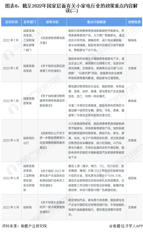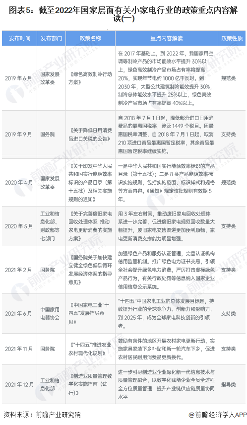 2022年1月,國家發改委擬定《關于做好近期促進消費工作的通知》,鼓勵有條件的地方開展綠色智能家電下鄉,通過企業讓利、降低首付比例等方式,促進農村居民消費。支持家電、家具等企業開展“以舊換新”、“以換代棄”活動,加強家電安全使用年限標準等宣傳解讀,鼓勵家電合理更新。2022年一季度,中國境內零星爆發新型冠狀肺炎疫情導致經濟增長受阻,國務院也于2022年5月制定了一攬子穩住經濟的政策措施,其中提及穩定家電產品的消費。總結梳理來看,近年來國家層面對于小家電行業的政策關鍵詞在于:新一輪家電下鄉、以舊換新、補貼消費、家電回收。