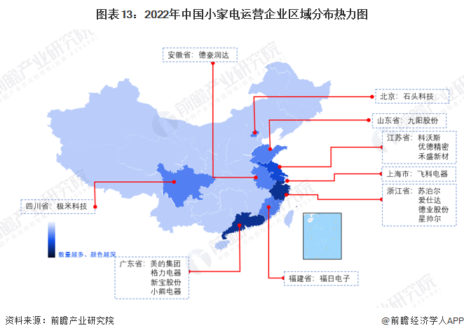 截至2022年6月中旬,根據中國企業數據庫企查貓,目前中國小家電行業的主要企業共有4348家,從企業主體注冊地分布來看,中國小家電企業主要分布在珠三角及華東區域,特別以廣東和浙江為代表,目前廣東共有相關小家電企業數2113家,浙江則有1654家。而從小家電產業鏈相關上市企業分布情況來看,兩地也是聚集了眾多的企業,如廣東的美的集團、格力電器、新寶股份、小熊電器,浙江的蘇泊爾、愛仕達、德業股份等。