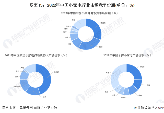 綜合來看,目前中國小家電行業龍頭企業是美的集團,其小家電業務營收規模遙遙領先,但具體至三個競爭派系中佼佼者各異。廚房小家電(以首要產品電飯煲為例)領域,2022年前4個月,蘇泊爾市場份額達到30.9%,占據第一;美的集團、九陽股份位列第二、三名,市場份額分別為26.8%及10.2%。家居小家電(以首要產品掃地機為例)領域,2021年,科沃斯憑借旗下科沃斯掃地機器人及添可洗地機良好的市場口碑,占據了家居小家電領域45%的市場份額;小米科技、石頭科技市場份額分別為16%及14%。在個護小家電領域,2021年飛利浦占據了24.6%市場份額排名第一,飛科電器及戴森分別占據11.7%及10.5%的市場份額。