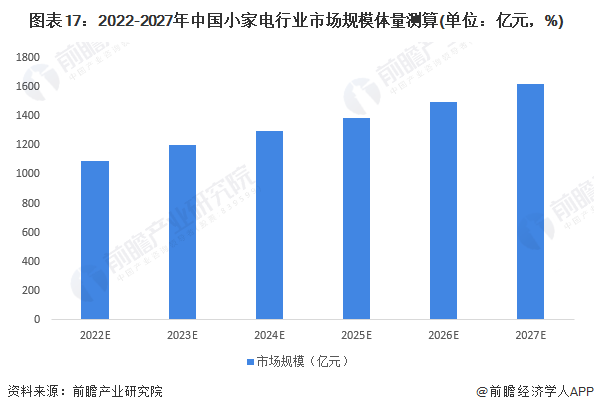 2021年,由于原材料價格上漲、宅經濟減弱、上年市場規模基數較大等原因,中國小家電行業整體市場規模增速僅為0.99%,市場規模達到1017億元。展望未來,廚房小家電目前市場規模占據了小家電行業“半壁江山”,但行業、產品較為成熟,競爭格局穩定,廚房小家電未來增速有所放緩;而家居小家電、個護小家電領域,在消費升級的刺激下,產品也不斷創新升級,推陳出新滿足當下需求熱點,行業競爭較為充分,行業整體成長性良好,未來行業將保持中高增速。經初步測算,2027年,中國小家電行業市場規模約為1611億元。