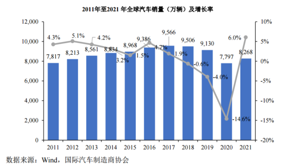2020年,全球汽車市場低迷,汽車銷量下降至7,797萬輛,隨著經濟形勢逐步好轉,汽車市場逐漸回暖,2021年全球汽車銷量約8,268萬輛。