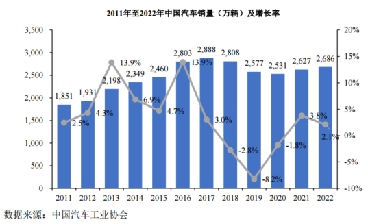 根據中國汽車工業協會統計,2022年,中國汽車銷量約2,686萬輛,同比增長2.1%。