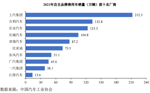 根據中國汽車工業協會統計,2021年中國自主品牌乘用車銷量前十名廠商分別為:上汽集團、吉利汽車、長安汽車、長城汽車、奇瑞汽車、比亞迪、東風汽車、廣汽集團、一汽集團和江淮汽車,合計銷售乘用車882.3萬輛,占自主品牌乘用車銷量占比約92.46%,在中國乘用車總銷量中占比約41.07%。
