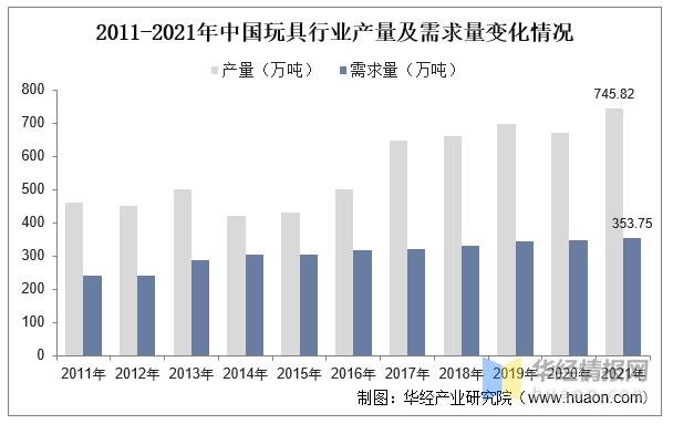 中國是世界最大的玩具生產和出口國、第二大玩具消費市場。據統計,近年來我國玩具行業產量呈現出波動增長態勢,2021年玩具產量達到745.85萬噸,同比增長10.97%;需求量方面保持穩定增長,從2011年的241.87萬噸上升至2021年的353.75萬噸,期間年均復合增長率為3.88%。