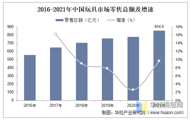 隨著我國玩具制造業持續發展,零售規模穩定增長。根據中國玩具和嬰童用品協會數據,從2016年到2021年,我國玩具市場零售總額逐年增長,從556億元增長至854.6億元,年復合增長率為8.98%,行業發展態勢良好,市場空間不斷拓展。