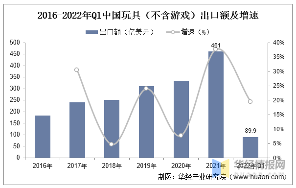 我國玩具產業重出口,工業化程度高但多以代工貼牌模式進行。根據中國玩具和嬰童用品協會數據,2021年中國玩具(不含游戲)出口額達到461億美元,同比增長37.6%。2022年一季度,中國玩具(不含游戲)累計出口額為89.9億美元,較2021年同期增長19.4%