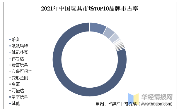 與發達國家相比,我國玩具行業目前市場格局較為分散,國產玩具品牌的市占率和影響力在國內仍整體偏弱。2021年,在中國玩具市場TOP10品牌中,樂高占據領導地位,占比7.7%。其次是泡泡瑪特,達到4.3%的市占率,排名第二,第三名為姚記撲克,市占率為3.1%,其余玩具品牌占比均不足1%。