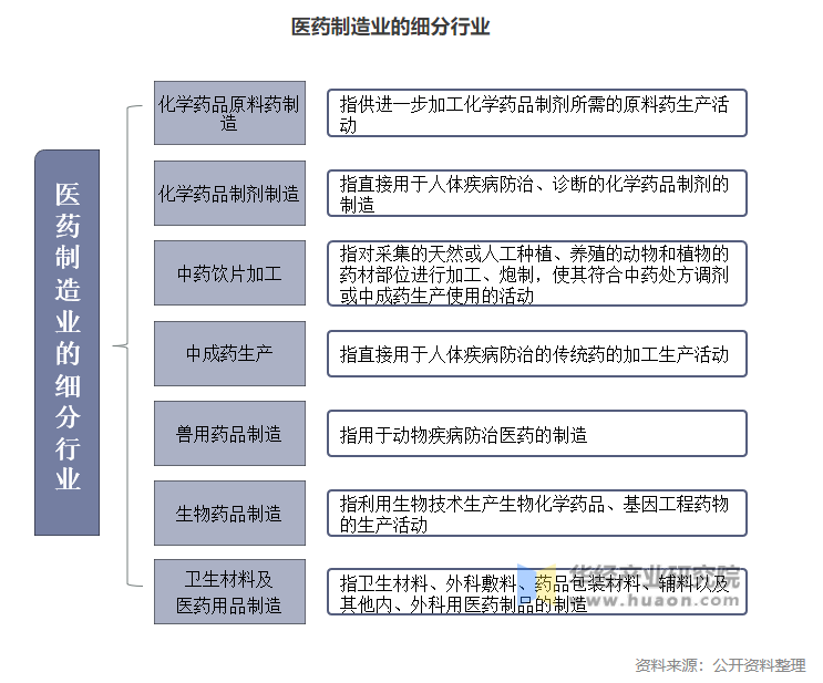 2、細(xì)分行業(yè):醫(yī)藥制造業(yè)具體可以細(xì)分為化學(xué)藥品原料藥制造、化學(xué)藥品制劑制造、中藥飲片加工、中成藥生產(chǎn)、獸用藥品制造、生物藥品制造和衛(wèi)生材料及醫(yī)藥用品制造七個(gè)行業(yè)。我國醫(yī)藥制造企業(yè)是指以藥品研發(fā)、生產(chǎn)及銷售為主的企業(yè)。根據(jù)具體藥品生產(chǎn)業(yè)務(wù)線的不同,《中國高技術(shù)產(chǎn)業(yè)統(tǒng)計(jì)年鑒》將我國醫(yī)藥制造業(yè)分為三大種類:化學(xué)藥品制造、生物藥品制造和中成藥制造。