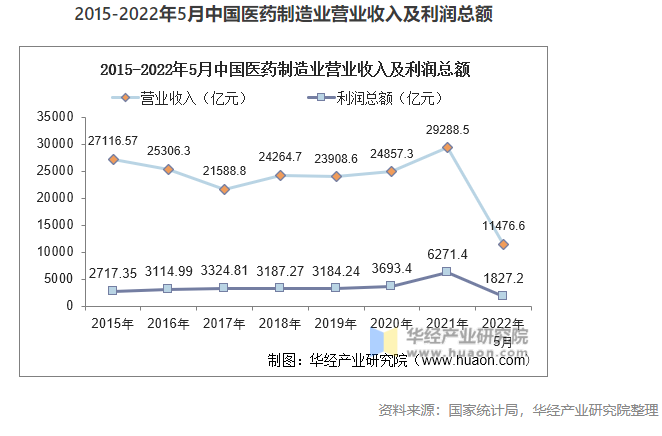 2016年,醫(yī)藥制造業(yè)由于受到一系列政策調(diào)控和企業(yè)轉(zhuǎn)型的影響,藥品價(jià)格受到嚴(yán)格監(jiān)管和控制,行業(yè)整體營業(yè)收入出現(xiàn)下滑,隨后市場(chǎng)競(jìng)爭(zhēng)環(huán)境改善,營業(yè)收入逐漸恢復(fù)增長(zhǎng)趨勢(shì),2021年中國醫(yī)藥制造業(yè)的營業(yè)收入為29288.5億元,利潤(rùn)總額為6271.4億元,利潤(rùn)率為21.4%,截至2022年5月,我國醫(yī)藥制造業(yè)2022年利潤(rùn)率為15.9%。