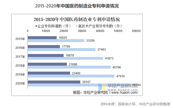 作為技術(shù)含量最高的行業(yè)之一,醫(yī)藥制造業(yè)必須不斷投入新藥品的研發(fā),提升行業(yè)整體創(chuàng)新能力和研發(fā)水平,才能提高醫(yī)藥制造業(yè)的競(jìng)爭(zhēng)力。根據(jù)國家統(tǒng)計(jì)局?jǐn)?shù)據(jù)顯示2020年我國醫(yī)藥制造業(yè)企業(yè)專利申請(qǐng)數(shù)為29107個(gè),高技術(shù)產(chǎn)業(yè)專利有效數(shù)56784件,同比增長(zhǎng)18.7%