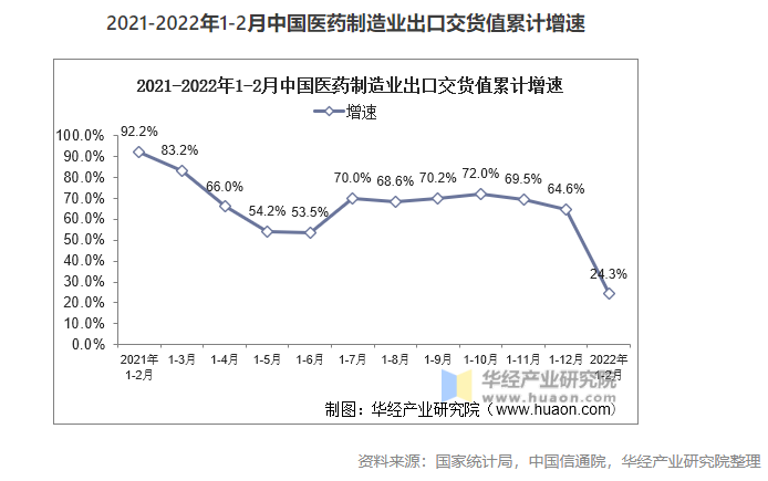 出口交貨值保持較快增長(zhǎng)態(tài)勢(shì)。受海外疫情持續(xù)爆發(fā)影響,防疫物資產(chǎn)品出口需求強(qiáng)勁,支撐醫(yī)藥制造業(yè)出口保持較快增長(zhǎng)。截至2022年1-2月,醫(yī)藥制造業(yè)出口交貨值同比增長(zhǎng)24.3%,在去年高基數(shù)的情況下繼續(xù)保持高速增長(zhǎng),較工業(yè)平均水平高7.4個(gè)百分點(diǎn)
