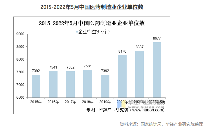 疫情前,受政策控制和行業(yè)嚴(yán)格監(jiān)管的影響,我國醫(yī)藥制造業(yè)企業(yè)單位數(shù)量較為穩(wěn)定,研發(fā)能力較弱的中小型企業(yè)逐漸退出市場(chǎng),2020年疫情席卷全球,市場(chǎng)迫切需要大量藥品和疫苗研發(fā),企業(yè)數(shù)量開始增長(zhǎng),截止2022年5月我國醫(yī)藥制造業(yè)企業(yè)有8677家。
