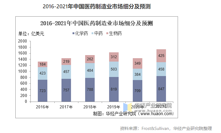 醫(yī)藥制造業(yè)三大種類中,化學(xué)藥的市場(chǎng)占比最多,化學(xué)藥主要用于人體疾病防治、診斷。應(yīng)用領(lǐng)域較為廣泛和普及,2020年我國化學(xué)藥市場(chǎng)規(guī)模大709億美元,占比49.2%;生物藥憑借其藥理活性高、特異性強(qiáng)、治療效果好等特點(diǎn),越來越受市場(chǎng)關(guān)注,其市場(chǎng)規(guī)模由2016年的184億美元增長(zhǎng)至2020年的349億美元。慢性病的治療周期較長(zhǎng),我國中藥在慢性病的治療中具有不可替代的作用,2021年我國中藥制造企業(yè)規(guī)模預(yù)計(jì)為458億美元。