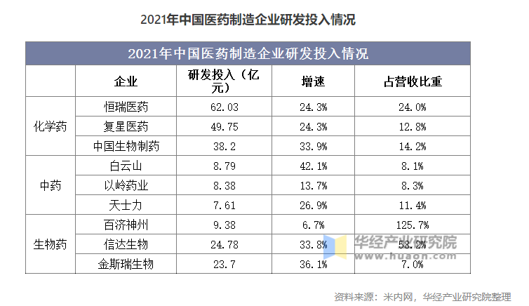隨著藥品審評(píng)審批制度改革、國家醫(yī)保常態(tài)化調(diào)整等政策改革,“創(chuàng)新”逐漸成為藥企的發(fā)展理念。化學(xué)制藥行業(yè)正在發(fā)生結(jié)構(gòu)性變化,隨著仿制藥出現(xiàn)藥品價(jià)格持續(xù)下降的同時(shí),行業(yè)集中度也有望提升;中醫(yī)藥行業(yè)政策利好不斷,相關(guān)部門從市場(chǎng)準(zhǔn)入、醫(yī)保支付、審評(píng)審批等多個(gè)維度對(duì)中醫(yī)藥行業(yè)形成政策支撐,中藥原材料價(jià)格上漲對(duì)企業(yè)決策也造成一定的影響;生物藥雖然起步晚于化學(xué)藥,但近年來卻受全球藥企熱捧,成為藥企和投資者競(jìng)爭(zhēng)的新方向,研發(fā)投入力度較大。