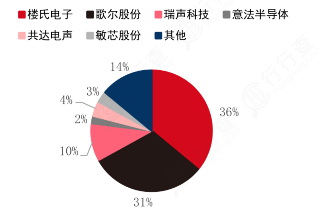 樓氏電子市場份額達36%,歌爾股份、瑞聲科技、共達電聲、敏芯股份市場規模分別達到31%/10%/4%/3%,合計占據48%。