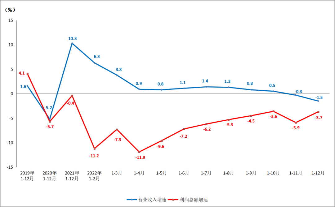 近日,國家統計局披露了2022年12月工業企業經濟效益狀況。縱觀2022,全年經濟運行受到國際形勢、國內疫情、高溫干旱等多重超預期因素反復沖擊,整體運行態勢偏弱。