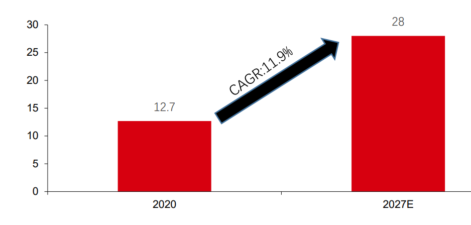 △2027年國內(nèi)軍用電源市場規(guī)模(單位: 億美元)