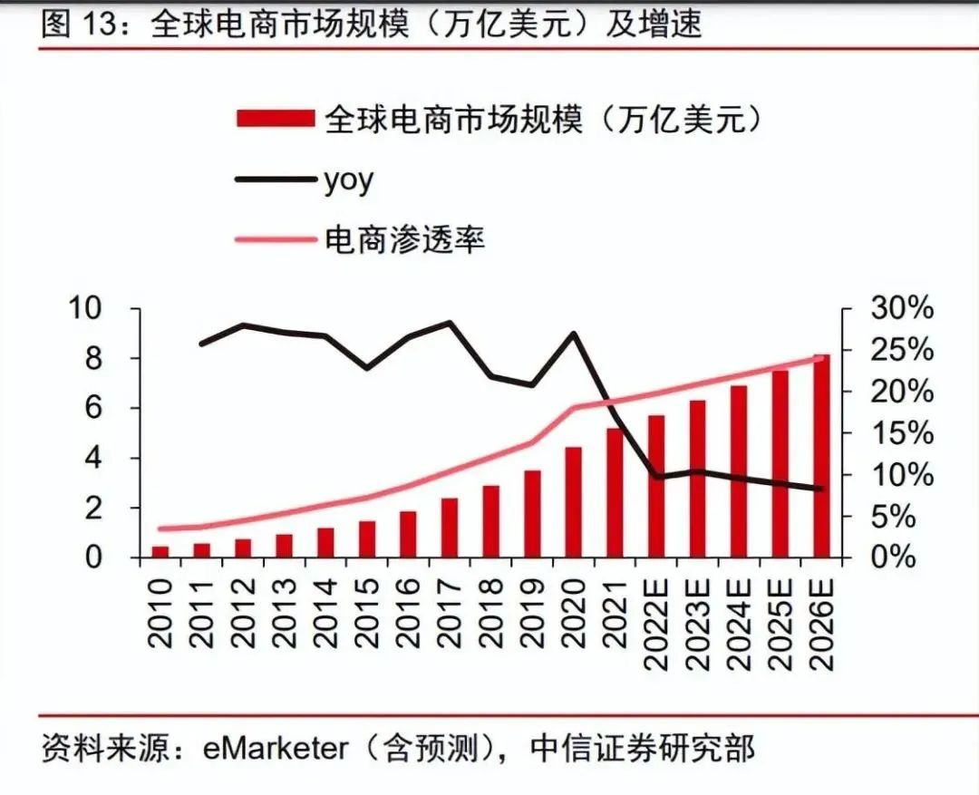 歐美電商市場發展成熟,高消費力支撐穩健基本盤。以北美市場為例,2021 年,美國電商用戶達 2.1 億,滲透率達 83.2%。盡管電商用戶的滲透已較為充分,但居民整體消費能力領先。2021年,北美地區人均 GDP 達 5.9 萬美元,是全球平均水平的 5.4 倍。同時,由于北美電商市場起步較早,物流、支付等基礎設施均已建設完善。高價值用戶及成熟的基礎設施體系有力地支撐了北美電商行業的發展,根據 eMarketer,2026 年,北美電商市場規模有望達 1.8 萬億,2022-2026 年 CAGR 約 12%,在全球電商市場占比約 22%。